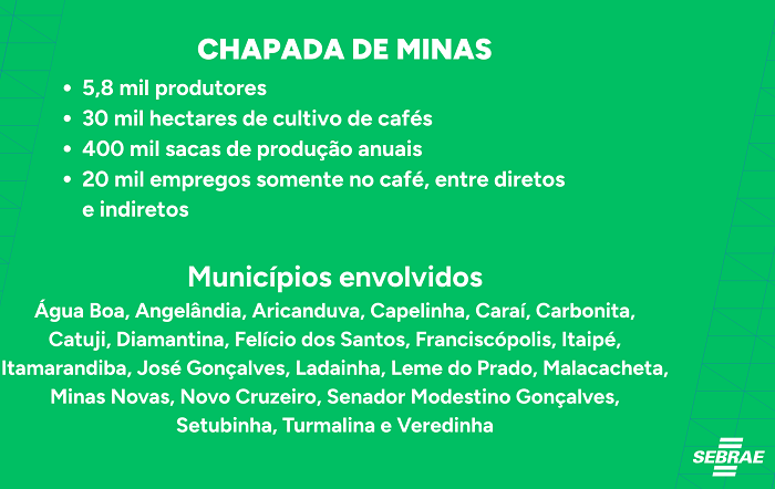 A Região da Chapada de Minas é formada pelos municípios de Água Boa, Angelândia, Aricanduva, Capelinha, Caraí, Carbonita, Catuji, Diamantina, Felício dos Santos, Franciscópolis, Itaipé, Itamarandiba, José Gonçalves, Ladainha, Leme do Prado, Malacacheta, Minas Novas, Novo Cruzeiro, Senador Modestino Gonçalves, Setubinha, Turmalina e Veredinha. O território conta com cerca de 5,8 mil produtores em uma área de 30 mil hectares cultivados, com produção anual estimada em 400 mil sacas.