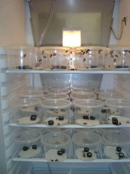As abelhas sem ferrão são mantidas em potes para controle durante testes de toxicidade de pesticida. Foto: Roberta Nocelli
