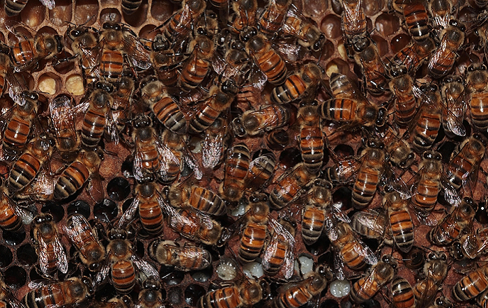 Favo de Apis mellifera, grandes produtoras de mel, com cria e operárias jovens responsáveis por alimentar as larvas e a rainha com geleia real. Foto: Fototeca Cristiano Menezes, FCM