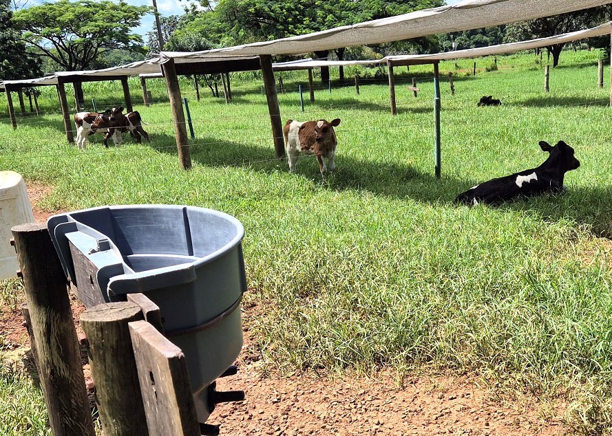 O pasto onde os bezerros planejados tem uma área total de 770 metros quadrados (m²), composta por capim Cynodon, dividida em 12 piquetes de 64 m², com sombra artificial.