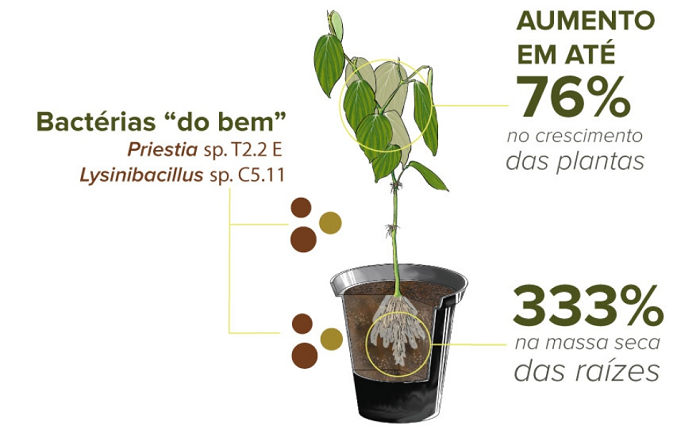 Os efeitos positivos das bactérias nas estacas foram atribuídos à capacidade dos microrganismos de produzir ácido indolacético (AIA) — um hormônio natural da planta que regula processos de crescimento vegetal — e sideróforos, compostos que capturam ferro no ambiente e tornam o nutriente mais disponível para as plantas. Os testes foram realizados em laboratório e em casas de vegetação, que simulam o ambiente natural. O próximo passo é realizar os testes em áreas de produtores e com outras variedades clonais de pimenteira-do-reino.