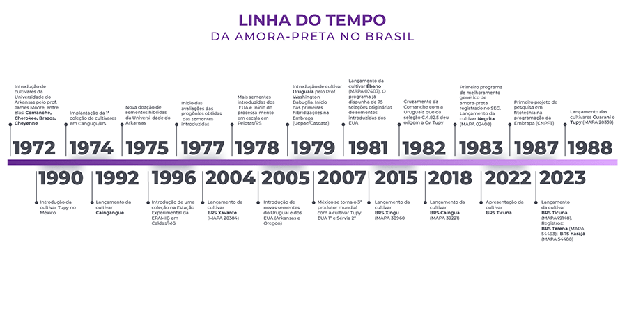 O melhoramento genético da amoreira-preta no Brasil começou no fim dos anos 1970 e atualmente o País possui dez cultivares nacionais adaptadas às condições brasileiras, atendendo às necessidades do agricultor e do mercado.