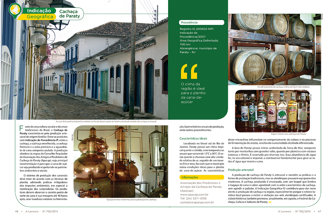 Também mereceu espaço a IG de Paraty (RJ), na edição nº 702 d’A Lavoura, páginas 44 a 47. A bebida destilada dessa região se caracteriza pela produção artesanal de origem familiar, envolvendo a fabricação de cachaça comum, cachaça envelhecida, cachaça premium e a extra premium, além da aguardente de cana composta azulada. Clique aqui e leia sem custo algum!