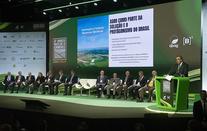 O presidente da ABAG, Caio Carvalho, deus as boas-vindas aos participantes do Congresso, durante a cerimônia que iniciou o evento e, em sua fala, expôs sua preocupação com o financiamento da produção, o seguro rural e o desenvolvimento de novos mecanismos financeiros privados para o acesso viável ao capital; que, para ele, é fundamental à resposta crescente da oferta brasileira de alimentos, bioenergias e outros produtos para as metas de segurança alimentar e de energias renováveis.