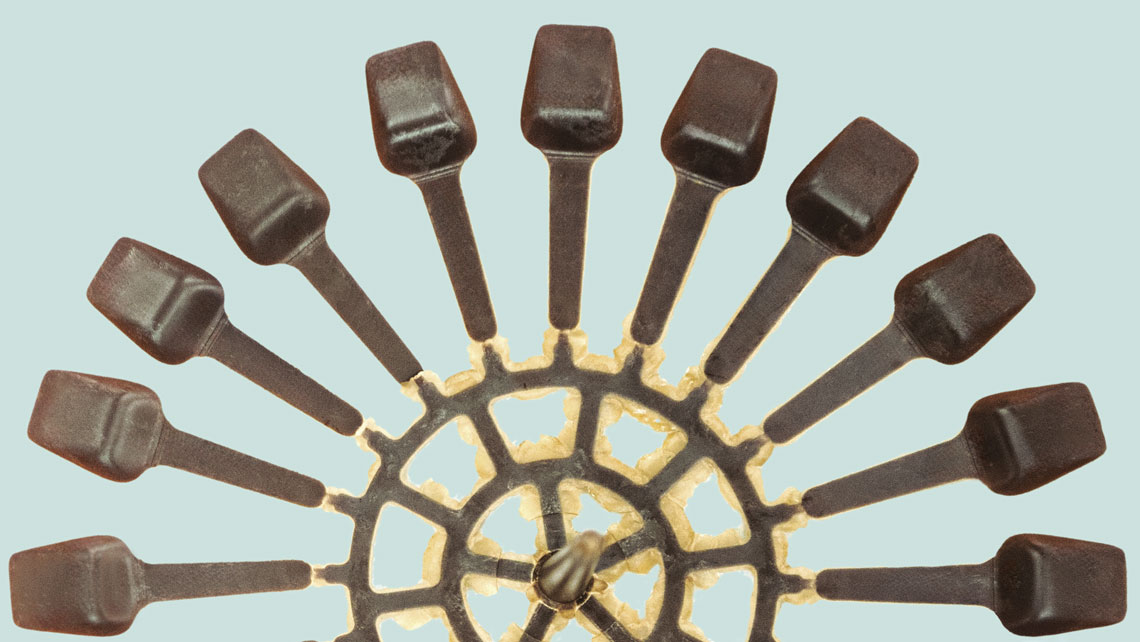 Em segundos, o molde se abriu e deixou cair um disco com 20 colheres pequenas e amarronzadas. Lopes retirou o disco, que saiu como deveria, e o depositou sobre uma bancada próxima.