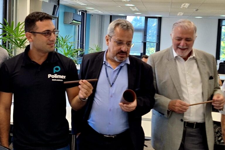 Gabriel Lysias, da Polimex, mostra seu produto para os presidentes da Pesagro, Paulo Renato Marques, e da Sociedade Nacional de…